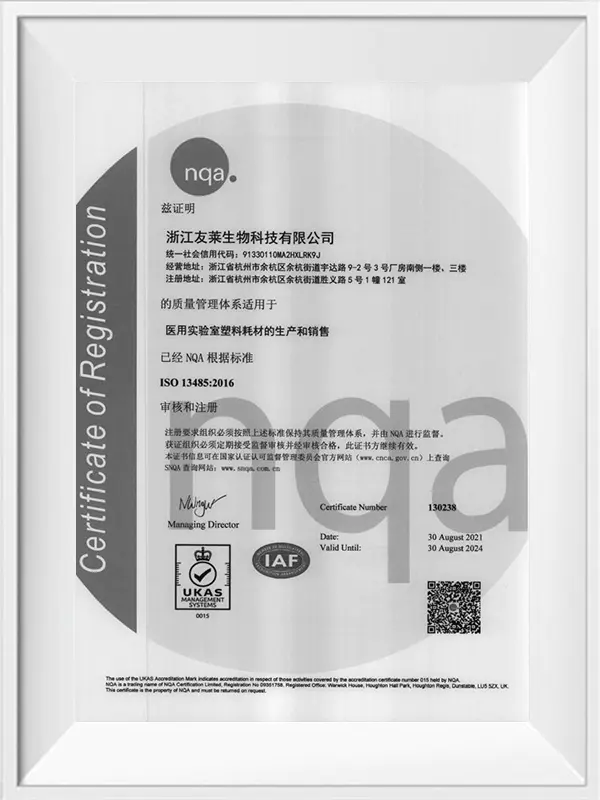 浙江友莱生物科技有限公司成立于 2020 年 5 月,生产基地位于杭州市余杭区未来科技城产业集聚区,目前拥有厂房 3200 平方米,其中净化车间 1500 平方米。销售中心位于杭州市西湖文化广场环球中心。它承袭专为国际知名品牌作 oem 的生产基因而生,立志成为国内外高端实验室耗材的领跑者。我们的创始人团队对产品的应用场景及制造有着完美的、专业级的理解与把控。友莱创立之初,就坚定着业界匠心精神,只为把产品做得更好,使之不断符合客户对更高品质的追求!公司产品分为三大板块:1、分子生物学领域科研配套的耗材;2、各大实验室自动化领域知名企业的设备配套耗材;3,为 IVD 企业定做高要求的非标化产品。友莱所生产的的全部产品严格按无酶、无热源的程序生产;所有产品严格选择医用级的原材料和品牌电动注塑机,保障了产品过硬的质量和杜绝了溶出物对实验的影响。同时,我们在企业内部设有业界资深专业人士领衔的分子与细菌培养实验室;使我们的产品生产后,可以对无酶,无热源,灭菌的检测多了一份保障;确保给我们客户的临床检测和科研项目带来无后顾之忧。 友莱的产品