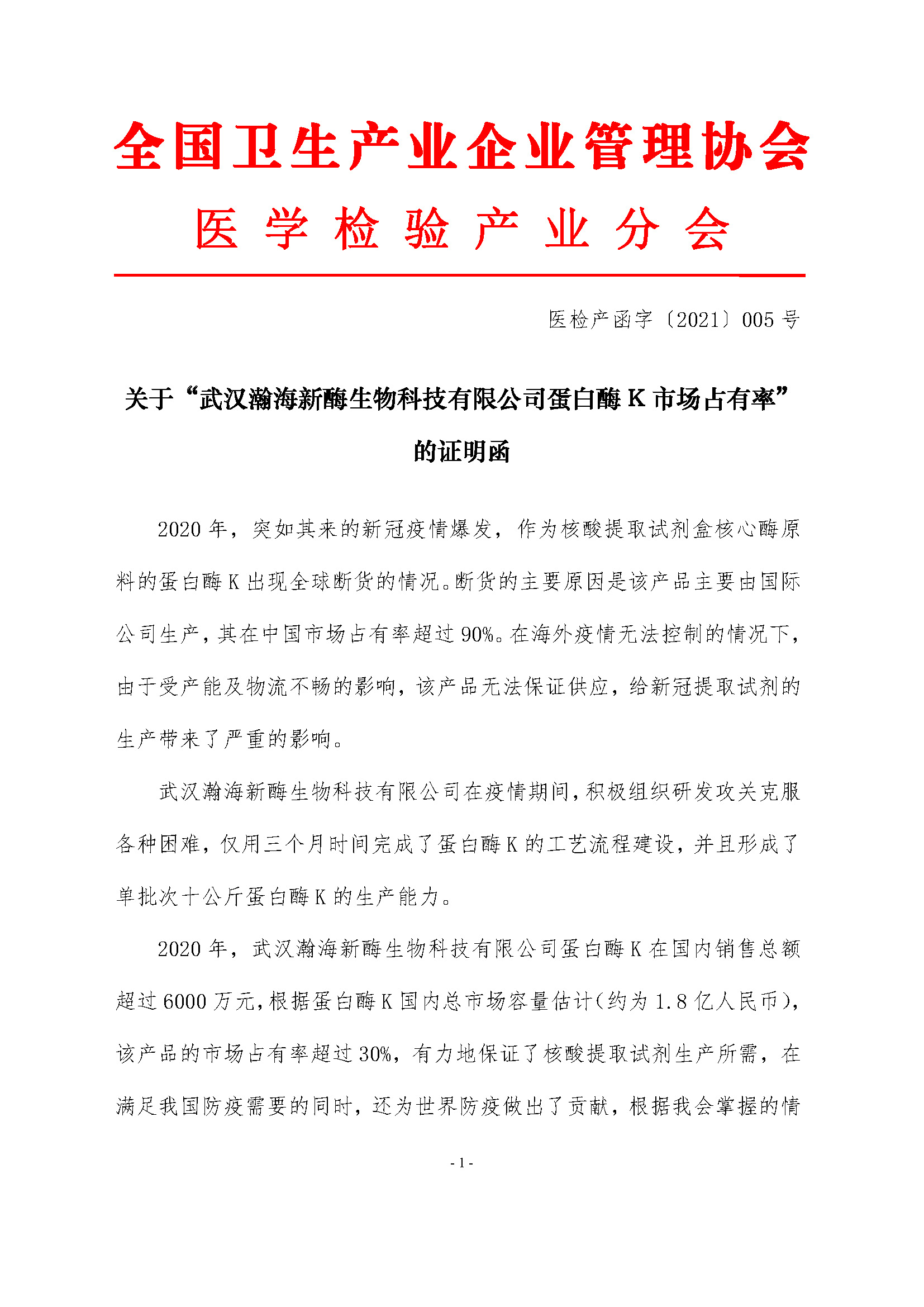 关于“武汉瀚海新酶生物科技有限公司蛋白酶K市场占有率”_页面_1