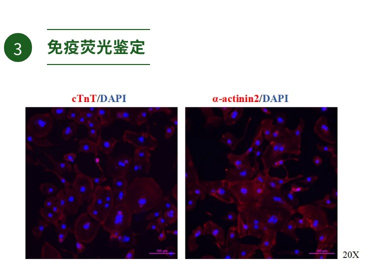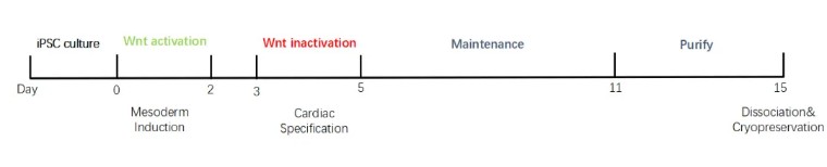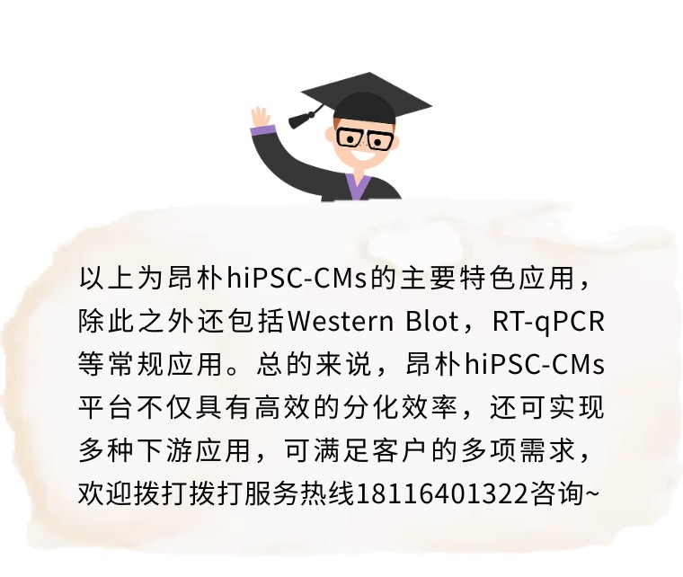 hiPSC经15天左右的分化时程,可获得纯度在90%以上且有节律搏动的心肌细胞。至今已验证数十个iPSC克隆,包括健康人及病人。说明此分化方法的普适性强,且分化效率高。