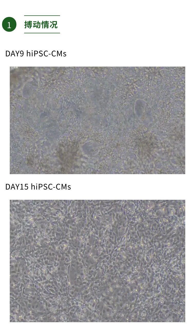 * 分化至DAY9,hiPSC-CMs细胞之间连接紧密,搏动频率高;分化至DAY15(已经历纯化过程), hiPSC-CMs呈现良好的、有规律的搏动,且纯度较高。