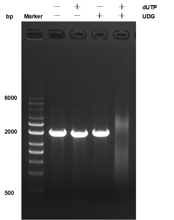 图1.使用UltraHiPF DNA Polymerase以Lambda DNA为模板,添加0.2mM的dUTP,扩增2kb的目标片段,最后用尿嘧啶-DNA糖基化酶(UDG) 37℃处理1小时。扩增结果为添加dUTP不影响扩增的效果;只有添加dUTP的产物,能够被尿嘧啶-DNA糖基化酶(UDG)消化,显示出UltraHiPF DNA Polymerase能够读取和扩增含有尿嘧啶和次黄嘌呤的模板的性能。