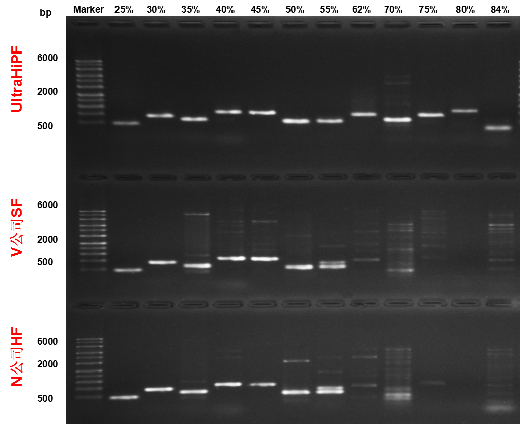 图4.使用UltraHiPF DNA Polymerase与两种竞品DNA Polymerase,以K562基因组为模板扩增不同GC含量的片段,结果显示从GC含量25%-84%,我们的UltraHiPF DNA聚合酶都可以实现高产量高特异性扩增,而V公司SF和N公司HF在同样的条件特异性扩增效果较弱,甚至无法扩增。
