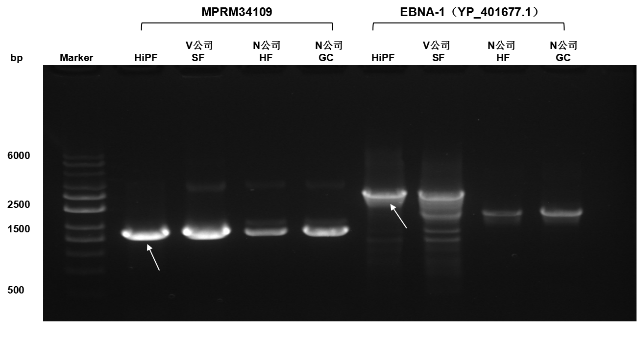 图5.使用UltraHiPF DNA Polymerase与两种竞品DNA Polymerase分别扩增MPRM34109和EBNA-1(YP_401677.1)的质粒模板,实验结果如图,其中箭头指示为扩增的目标片段。UltraHiPF DNA Polymerase均可进行特异性扩增,而V公司SF和N公司HF在同样条件下的扩增特异性较弱。