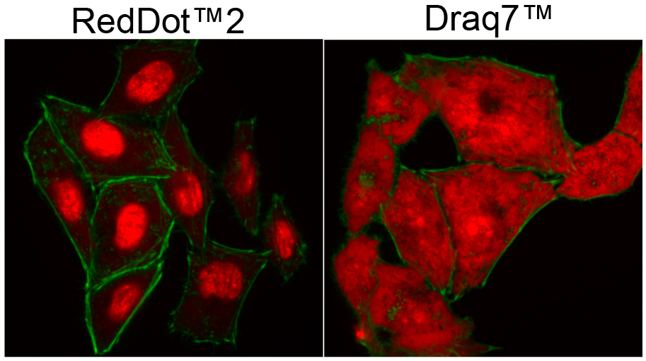 RedDot™2 is a far-red cell membrane-impermeant nuclear dye suitable for fixed cells or tissues, or selective dead cell staining. Unlike other far-red nuclear stains such as Draq7™, which can show significant cytoplasmic staining in permeabilized cells, RedDot™2 is nuclear-specific and offers highly selective nuclear counterstaining in fixed and permeabilized cells (Fig. 1).