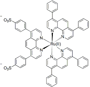 RuBP-2S (Ruthenium(bis(bathophenanthroline))(bathophenanthrolinedisulfonate) is a luminescent ruthenium complex similar to RuBPS (80021). Two of the bathophenanthroline ligands are neutral while the third bathophenanthroline ligand is bis-sulfonated, resulting in an overall neutral charge of the ruthenium complex. RuBP-2S shares the spectral properties of RuBPS and may also have similar applications.