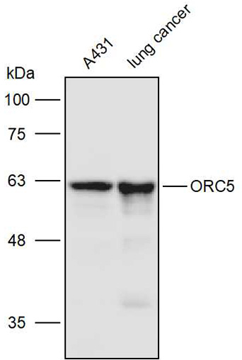 Western blot analysis with ORC5 antibody diluted at 1:2000;Lane:A431,Human lung cancer