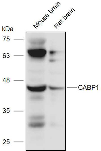 Western blot analysis with CABP1 antibody diluted at 1:2000;Lane:Mouse brain,Rat brain