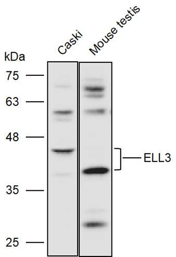 Western blot analysis with ELL3 antibody diluted at 1:2000;Lane:Caski,Mouse testis