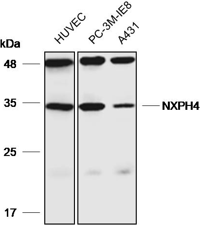 Western blot analysis with NXPH4 antibody diluted at 1:2000;Lane:HUVEC,PC-3M-IE8,A431