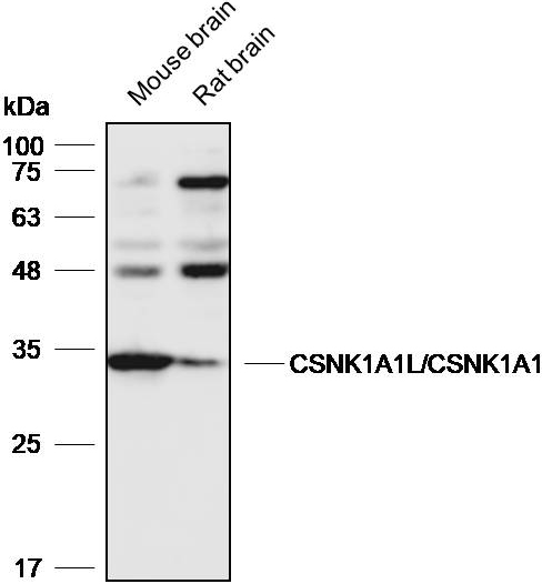 Western blot analysis with CSNK1A1L/CSNK1A1 antibody diluted at 1:2000;Lane: Mouse brain,Rat brain