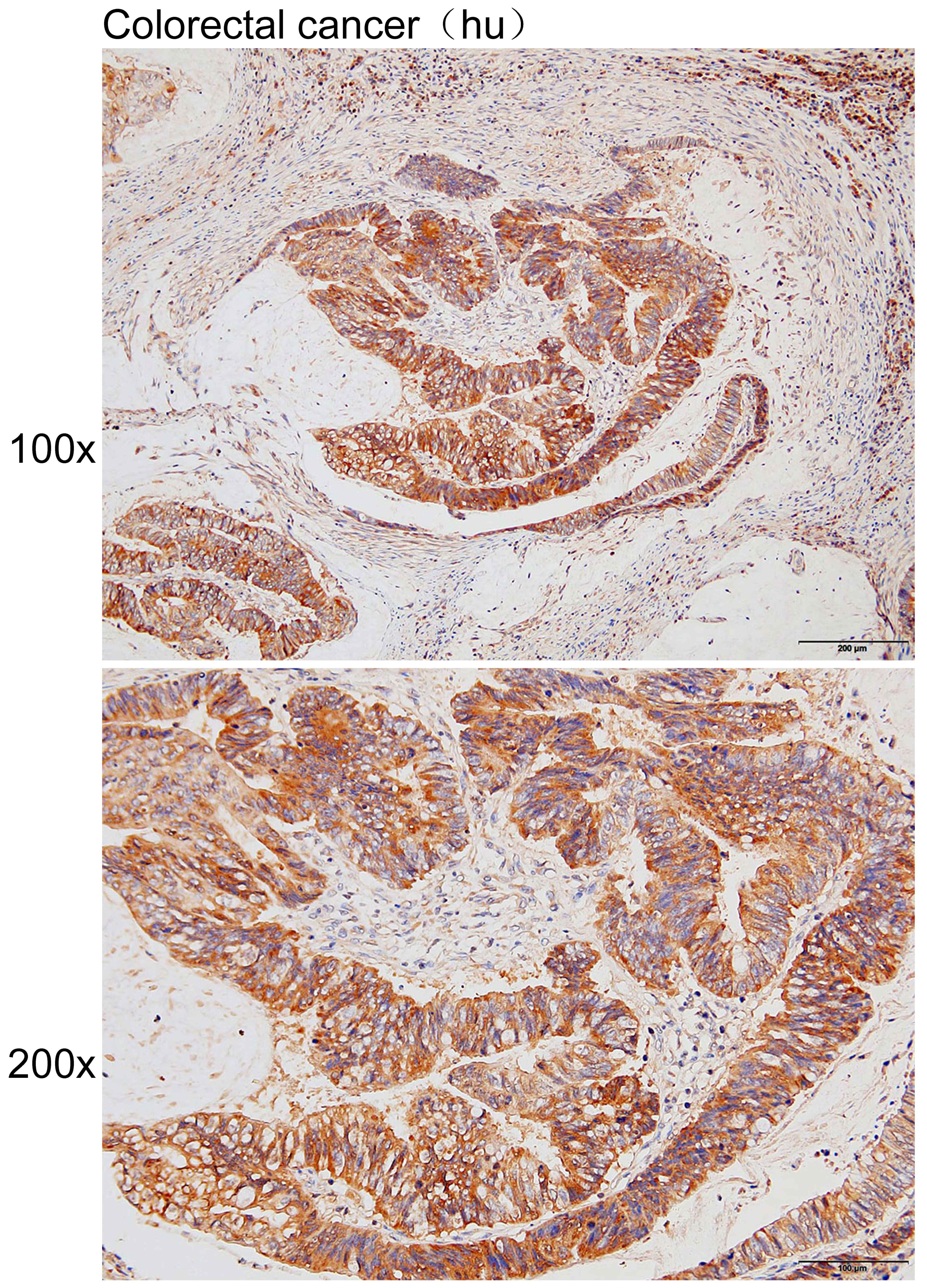 Immunohistochemistry of paraffin-embedded Human colorectal cancer with CSNK1A1L/CSNK1A1 antibody diluted at 1:100