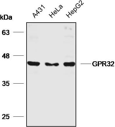 Western blot analysis with GPR32 antibody diluted at 1:2000;Lane:A431,Hela,HepG2