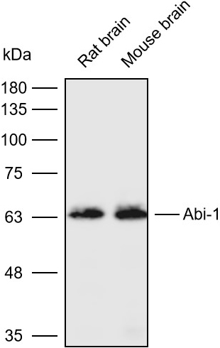 Western blot analysis with Abi1 antibody diluted at 1:2000;Lane:Rat brain,Mouse brain