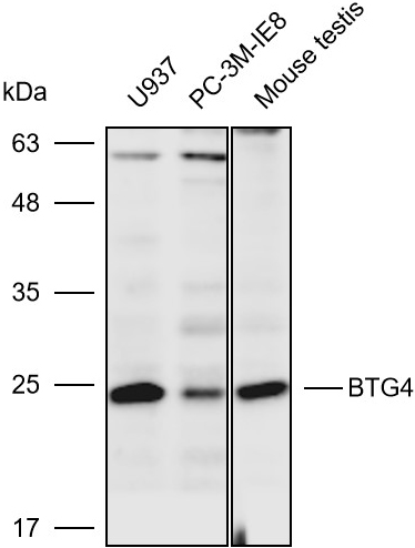 Western blot analysis with BTG4 antibody diluted at 1:2000;Lane:U937,PC-3M-IE8,Mouse thymus