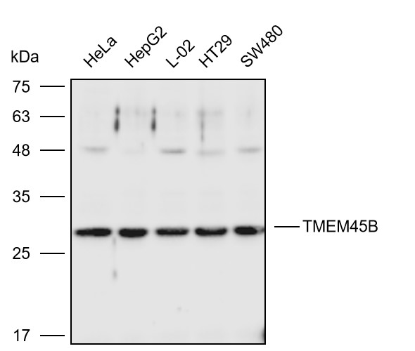Western blot analysis with TMEM45B antibody diluted at 1:2000;Lane:Hela,HepG2,L-02,HT29,SW480