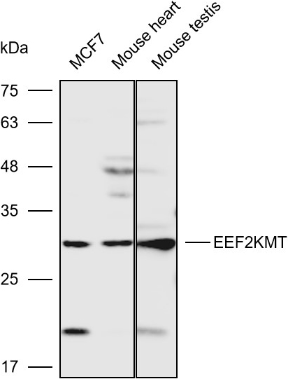 Western blot analysis with EEF2KMT antibody diluted at 1:4000;Lane: MCF7,Mouse heart,Mouse testis