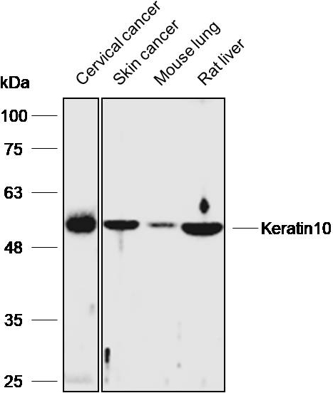 Western blot analysis with Keratin10 antibody diluted at 1:2000;Lane: Human cervical cancer,Human skin cancer,Mouse lung,Rat liver