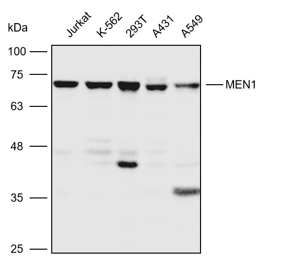 Western blot analysis with MEN1 antibody diluted at 1:4000;Lane: Jurkat,K-562,293T,A431,A549