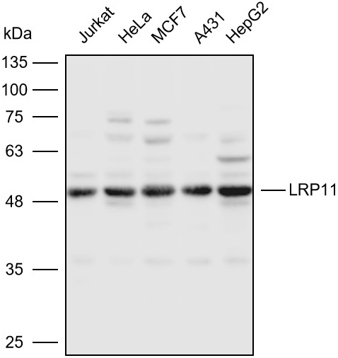 Western blot analysis with LRP11 antibody diluted at 1:2000;Lane: Jurkat,Hela,MCF7,A431,HepG2