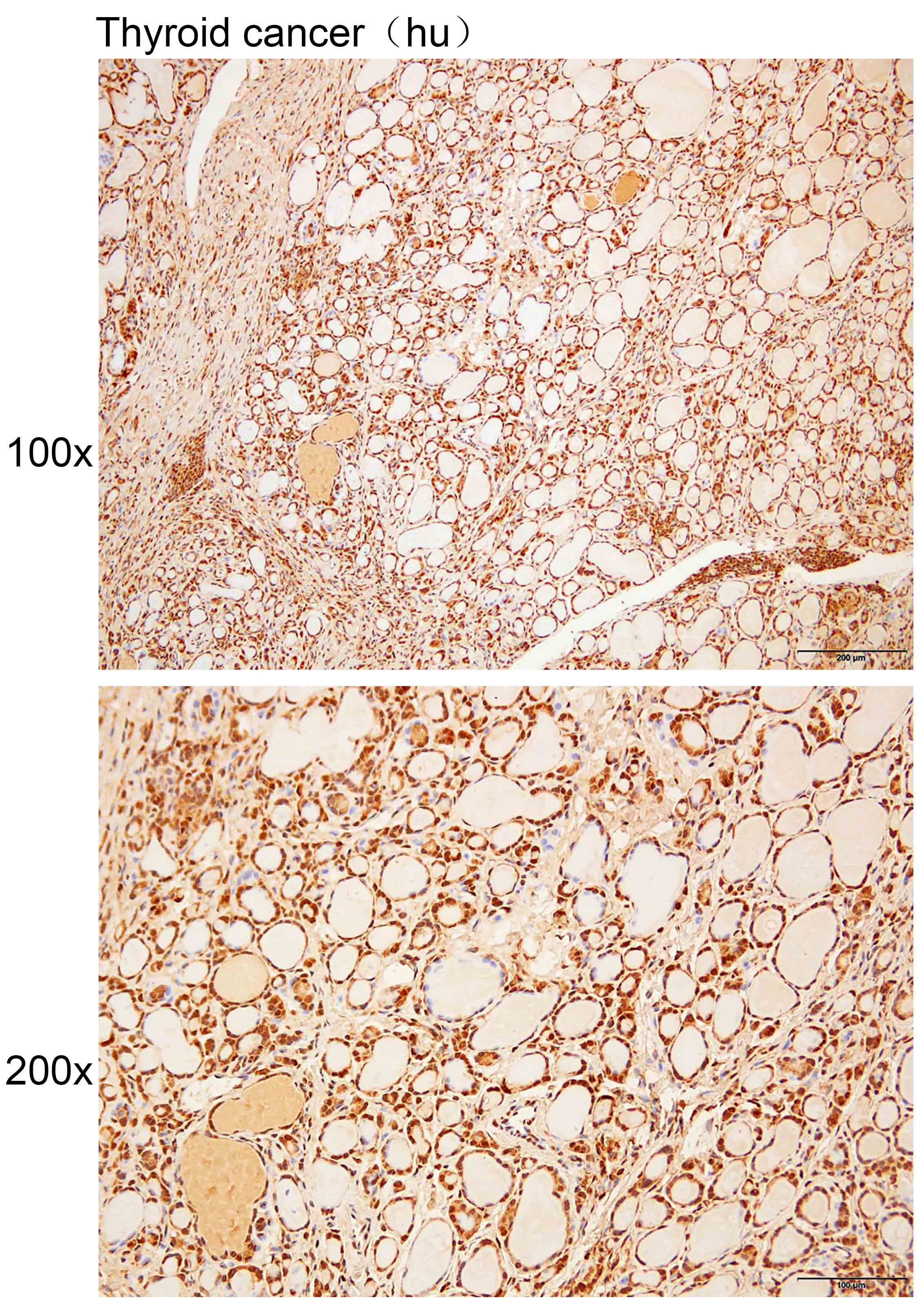 Immunohistochemistry of paraffin-embedded Human thyroid cancer with NUDCD3 antibody diluted at 1:80