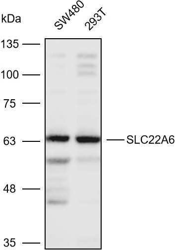 Western blot analysis with SLC22A6 antibody diluted at 1:2000;Lane:SW480,293T