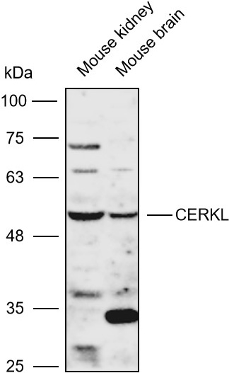 Western blot analysis with CERKL antibody diluted at 1:2000;Lane: Mouse kidney,Mouse brain