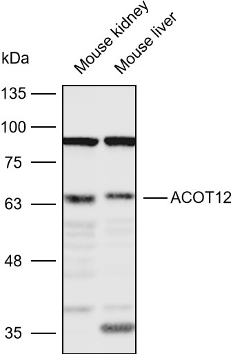 Western blot analysis with ACOT12 antibody diluted at 1:2000;Lane:Mouse kidney, Mouse liver