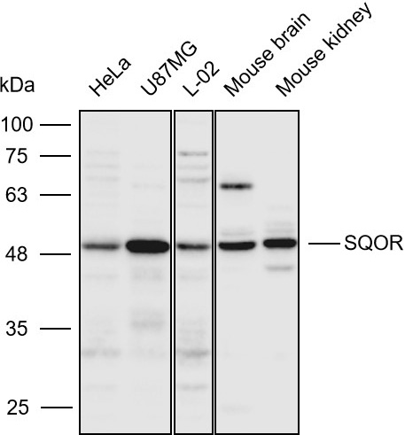 Western blot analysis with SQOR antibody diluted at 1:2000;Lane: HeLa,U87MG,L-02,Mouse brain,Mouse kidney