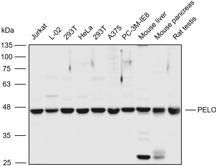 Western blot analysis with PELO antibody diluted at 1:2000;Lane: Jurkat,L-O2,293T,Hela,A375,PC-3M-IE8,Mouse liver,Mouse pancreas,Rat testis