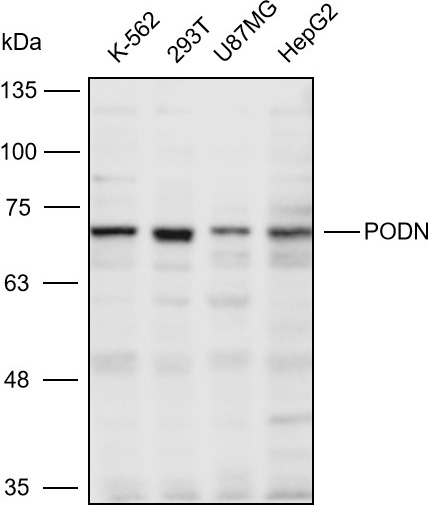 Western blot analysis with PODN antibody diluted at 1:1000;Lane: K562,293T,U87MG,HepG2