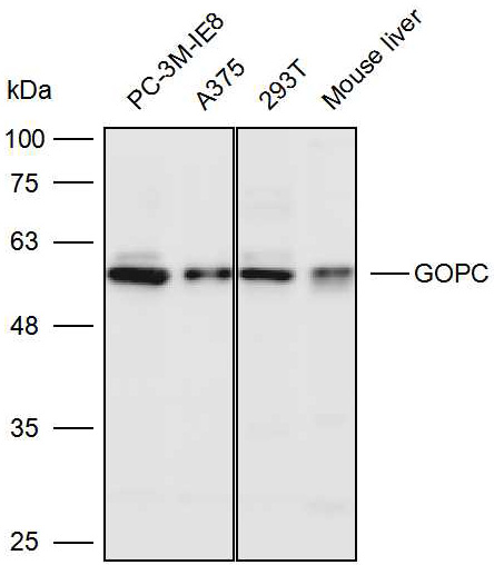 Western blot analysis with GOPC antibody diluted at 1:2000;Lane: PC-3,A375,293T,Mouse liver