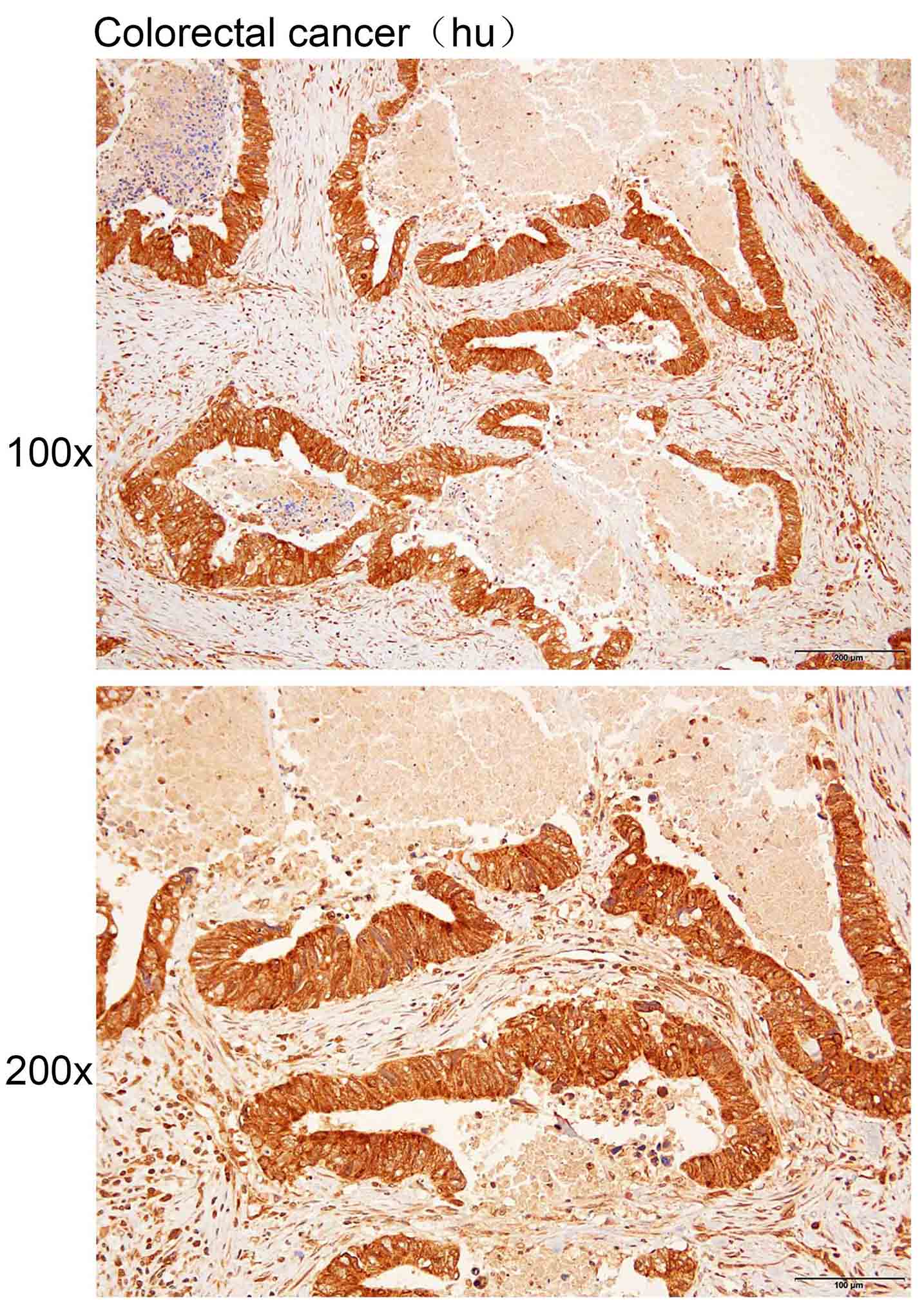 Immunohistochemistry of paraffin-embedded Human colorectal cancer with TUBB2C antibody diluted at 1:200