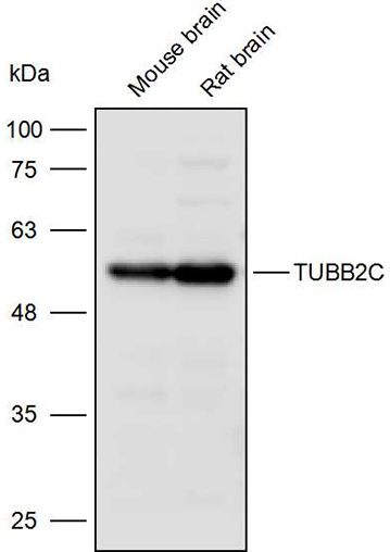 Western blot analysis with TUBB2C antibody diluted at 1:10000;Lane: Mouse brain, Rat brain