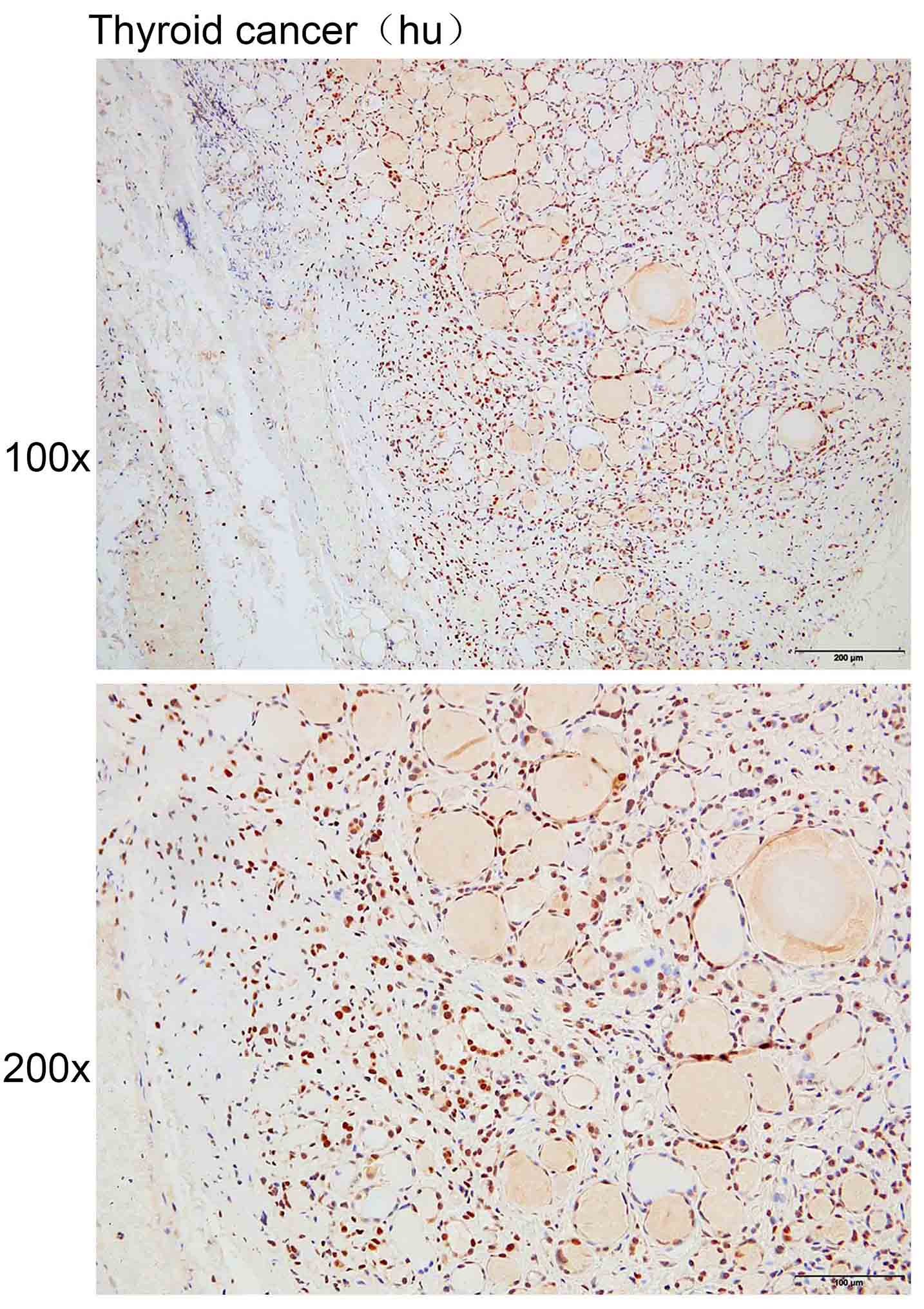 Immunohistochemistry of paraffin-embedded Human thyroid cancer with DYRK1B antibody diluted at 1:200