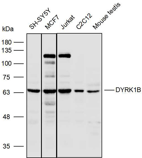 Western blot analysis with DYRK1B antibody diluted at 1:2000;Lane: SH-SY5Y,MCF7,Jurkat,C2C12,Mouse testis