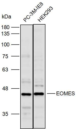 Western blot analysis with EOMES antibody diluted at 1:2000;Lane:PC3,HEK293