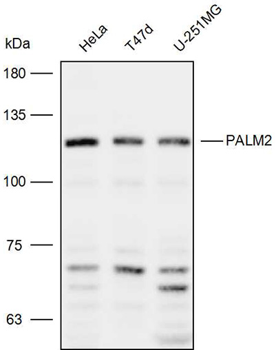 Western blot analysis with PALM2 antibody diluted at 1:2000;Lane:HeLa,T-47d,U-251MG