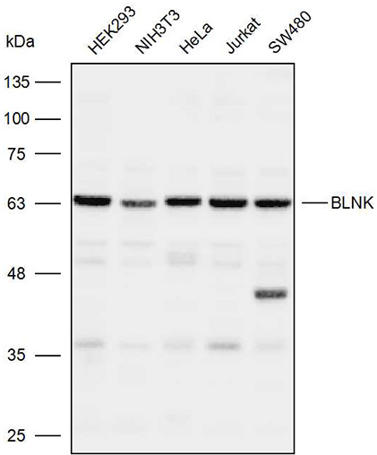 Western blot analysis with BLNK antibody diluted at 1:2000;Lane:HEK293,NIH3T3,HeLa,Jurkat,SW480