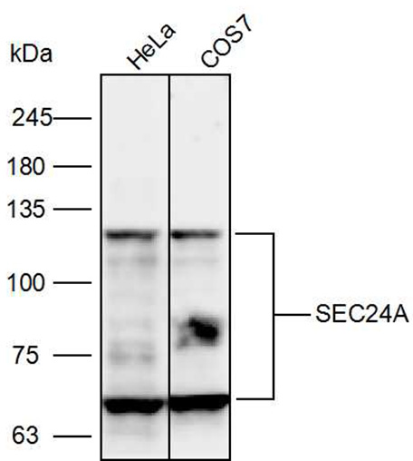 Western blot analysis with SEC24A antibody diluted at 1:2000;Lane:HeLa,COS7