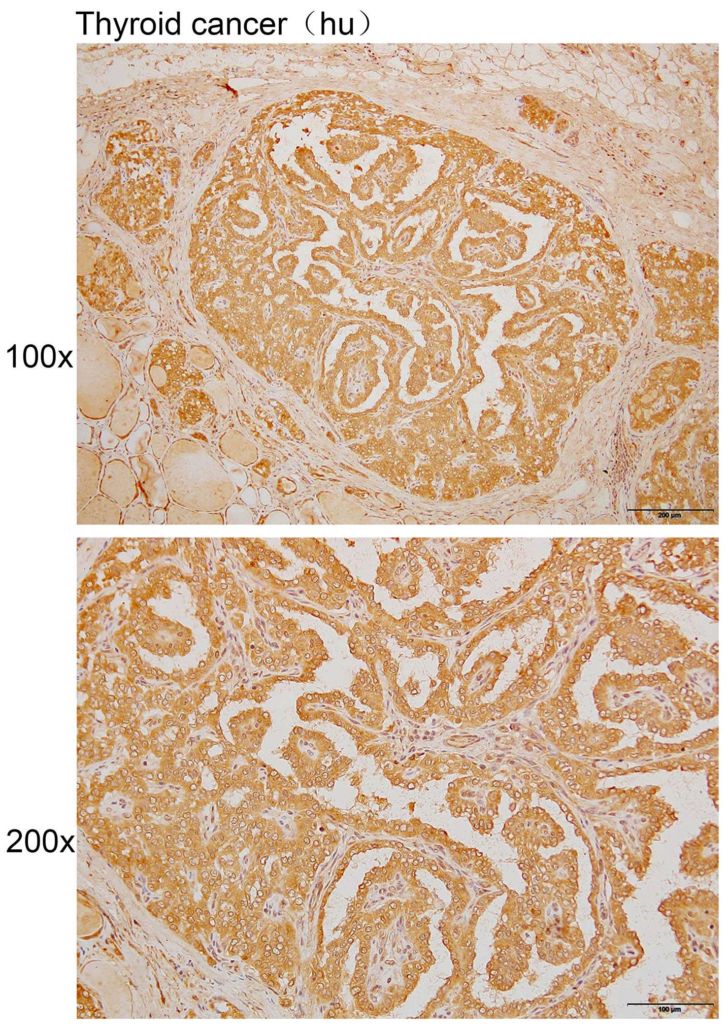 Immunohistochemistry of paraffin-embedded Human thyroid cancer with TRIM17 antibody diluted at 1:200