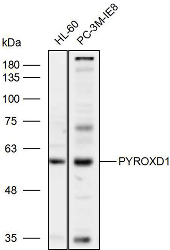 Western blot analysis with PYROXD1 antibody diluted at 1:2000;Lane: HL-60,PC-3M-IE8