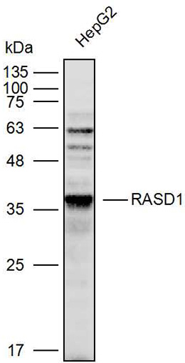 Western blot analysis with RASD1 antibody diluted at 1:2000;Lane: HepG2