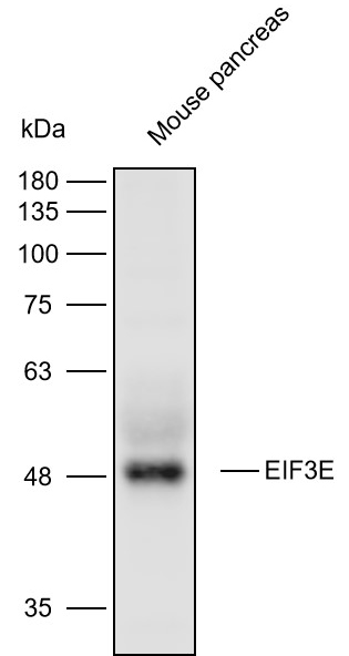Western blot analysis with EIF3E antibody diluted at 1:2000;Lane:Mouse pancreas