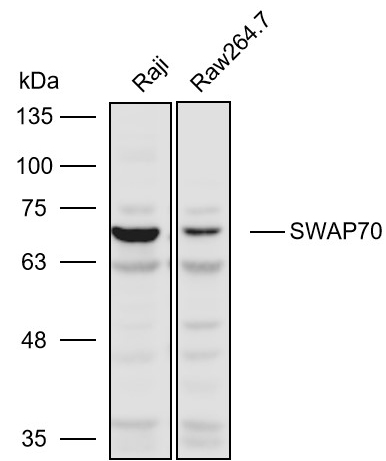 Western blot analysis with SWAP70 antibody diluted at 1:8000;Lane:Raji,Raw264.7