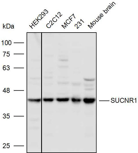 Western blot analysis with SUCNR1 antibody diluted at 1:2000;Lane:HEK293,C2C12,MCF-7,231,Mouse brain