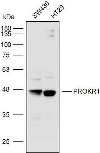 Western blot analysis with PROKR1 antibody diluted at 1:2000;Lane:SW480,HT29