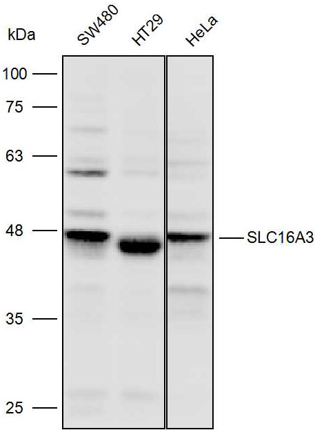 Western blot analysis with SLC16A3 antibody diluted at 1:3000;Lane:SW480,HT29,Hela