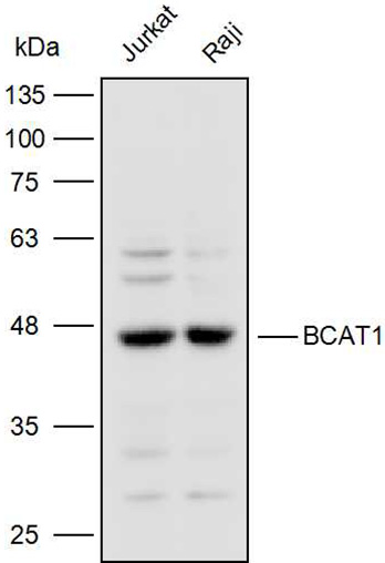 Western blot analysis with BCAT1 antibody diluted at 1:2000;Lane:Jurkat,Raji