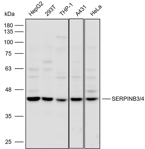 Western blot analysis with SERPINB3/4 antibody diluted at 1:3000;Lane:HepG2,293T,THP-1,A431,HeLa