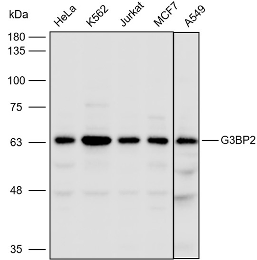 Western blot analysis with G3BP2 antibody diluted at 1:2000;Lane:HeLa,K562,Jurkat,MCF7,A549